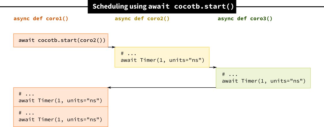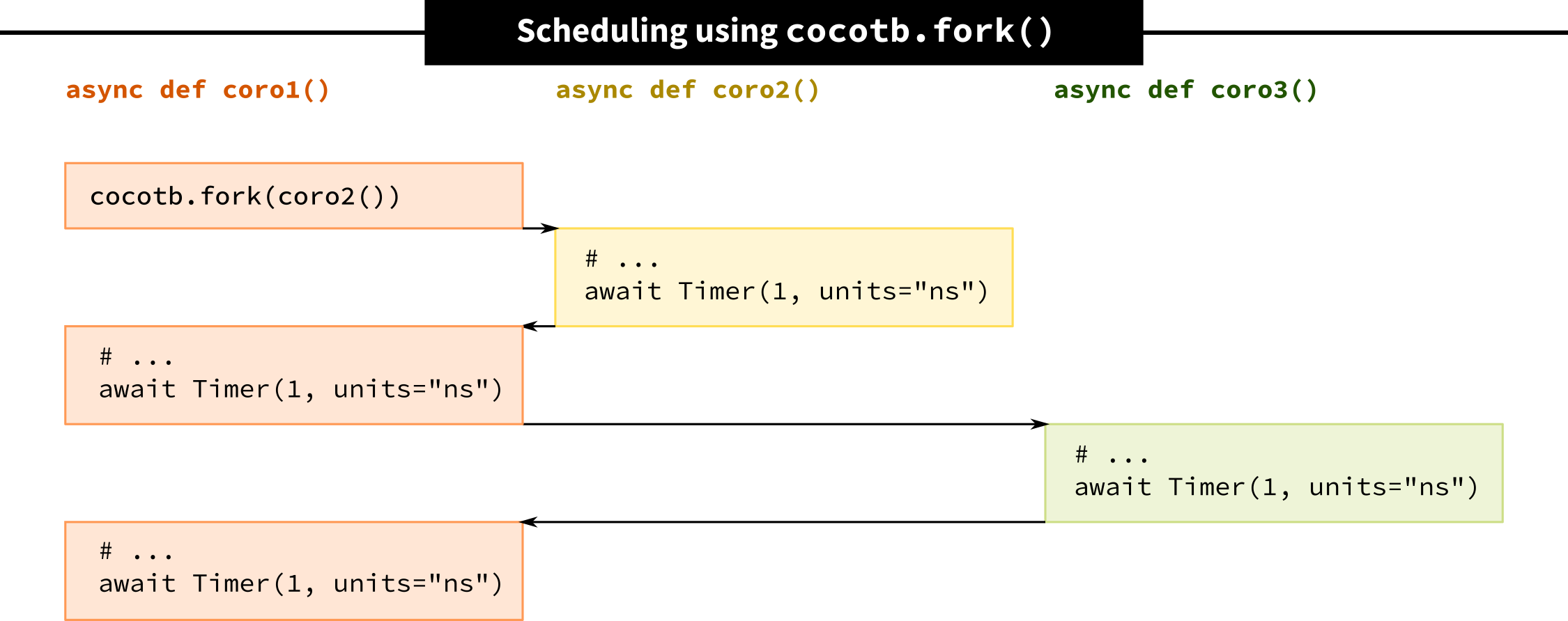 If you'd like to know more about coroutines and scheduling in cocotb have a look at the Coroutines and Tasks section in the documentation (which also explains the cocotb.create_task()
