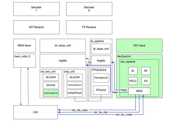"The Vector engine has been integrated with the BOOM (Berkeley OOO machine) core in the Chipyard SoC System-on-Chip environment. This design parameterises VLEN up to 512. We will be releasing more collateral in the next few weeks. This includes functional and compliance tests, architectural coverage, debug harness, and integration with Whisper, an open source RISC-V instruction set simulator.